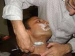The barber began to lather his face while a woman with the most